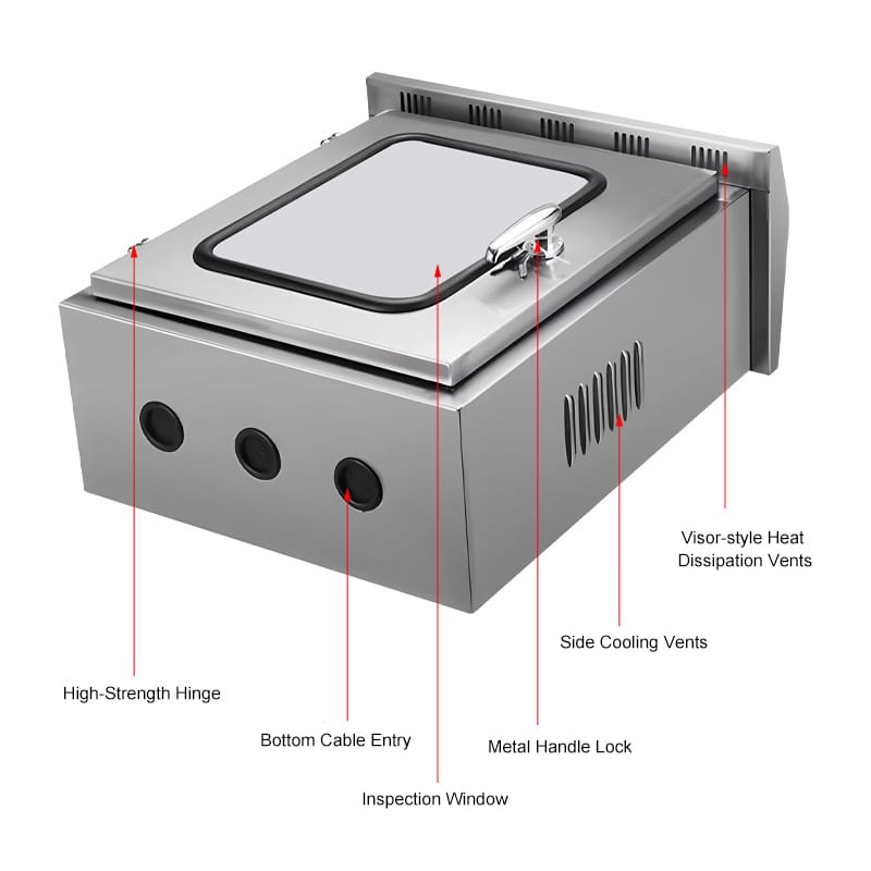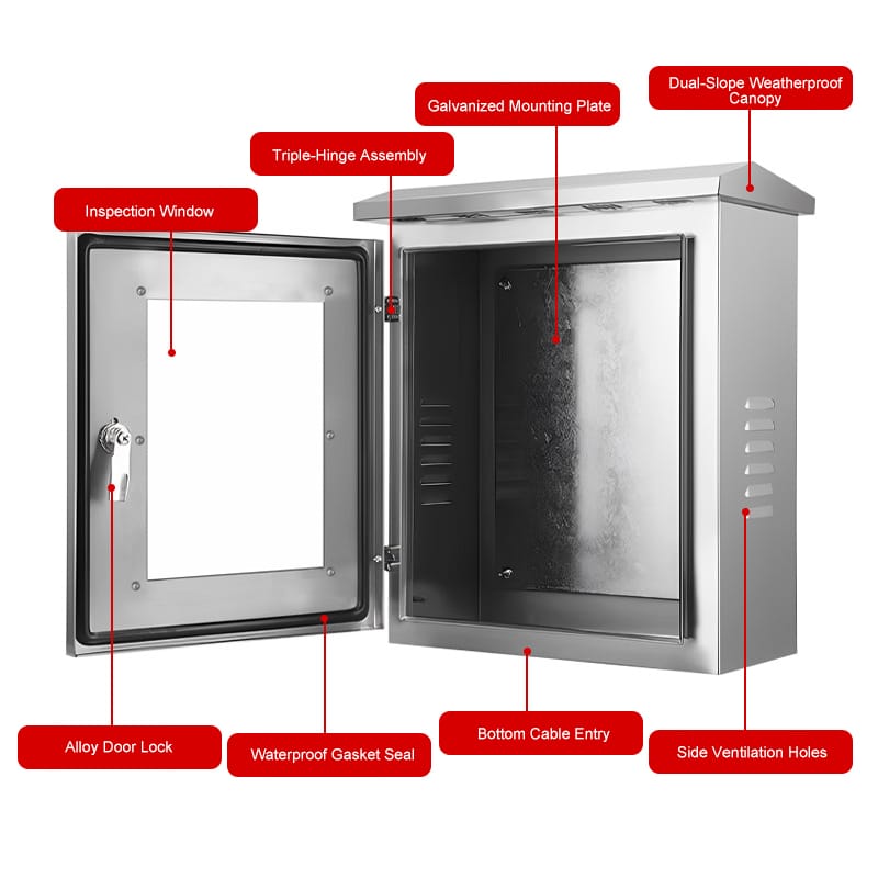 Stainless Steel Weatherproof Distribution Box (Visible/with Viewing Window)​​ is a high-quality electrical enclosure made of premium stainless steel, featuring ​​excellent rainproof, dustproof, and corrosion-resistant​​ properties. It is designed for ​​outdoor or humid environments​​, with a robust structure and tight sealing to effectively protect internal electrical components from rain, dust, and external damage.
